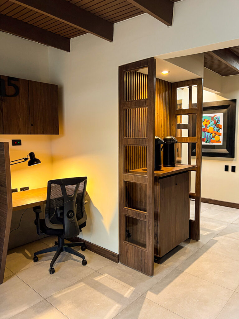 Ofrecemos café, té, aromática y agua ilimitados, disponibles todo el día para que te sientas como en casa mientras trabajas.